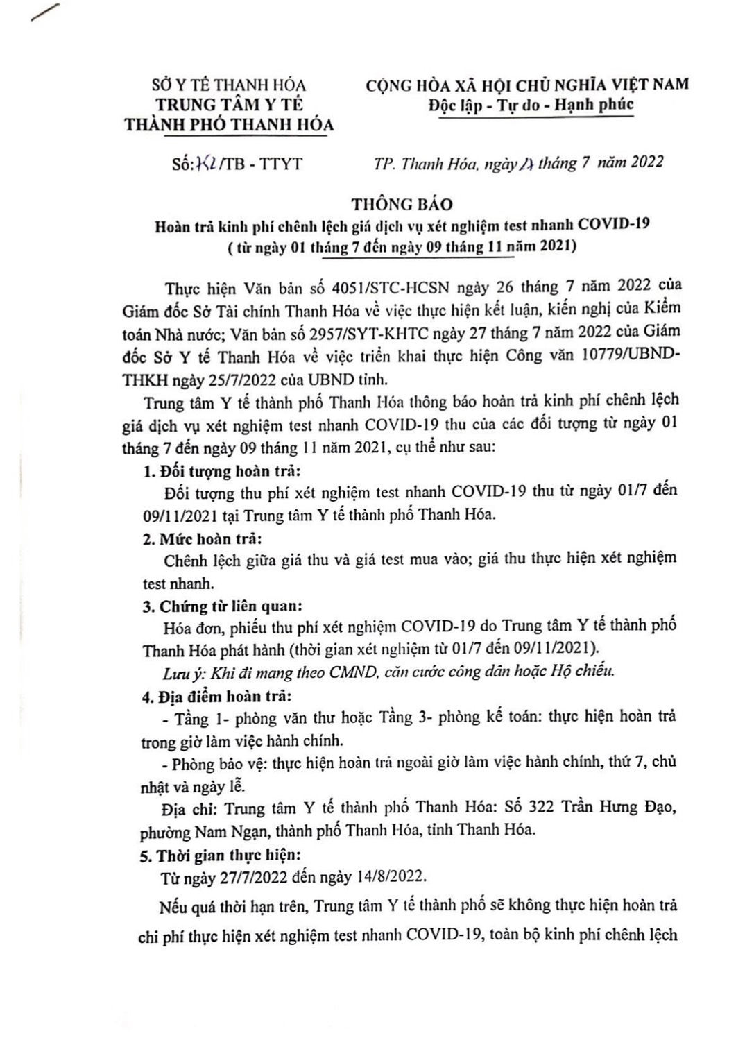 Thông báo Hoàn trả kinh phí chênh lệch giá dịch vụ xét nghiệm test nhanh COVID-19 (từ ngày 01 tháng 7 đến ngày 09 tháng 11 năm 2021)